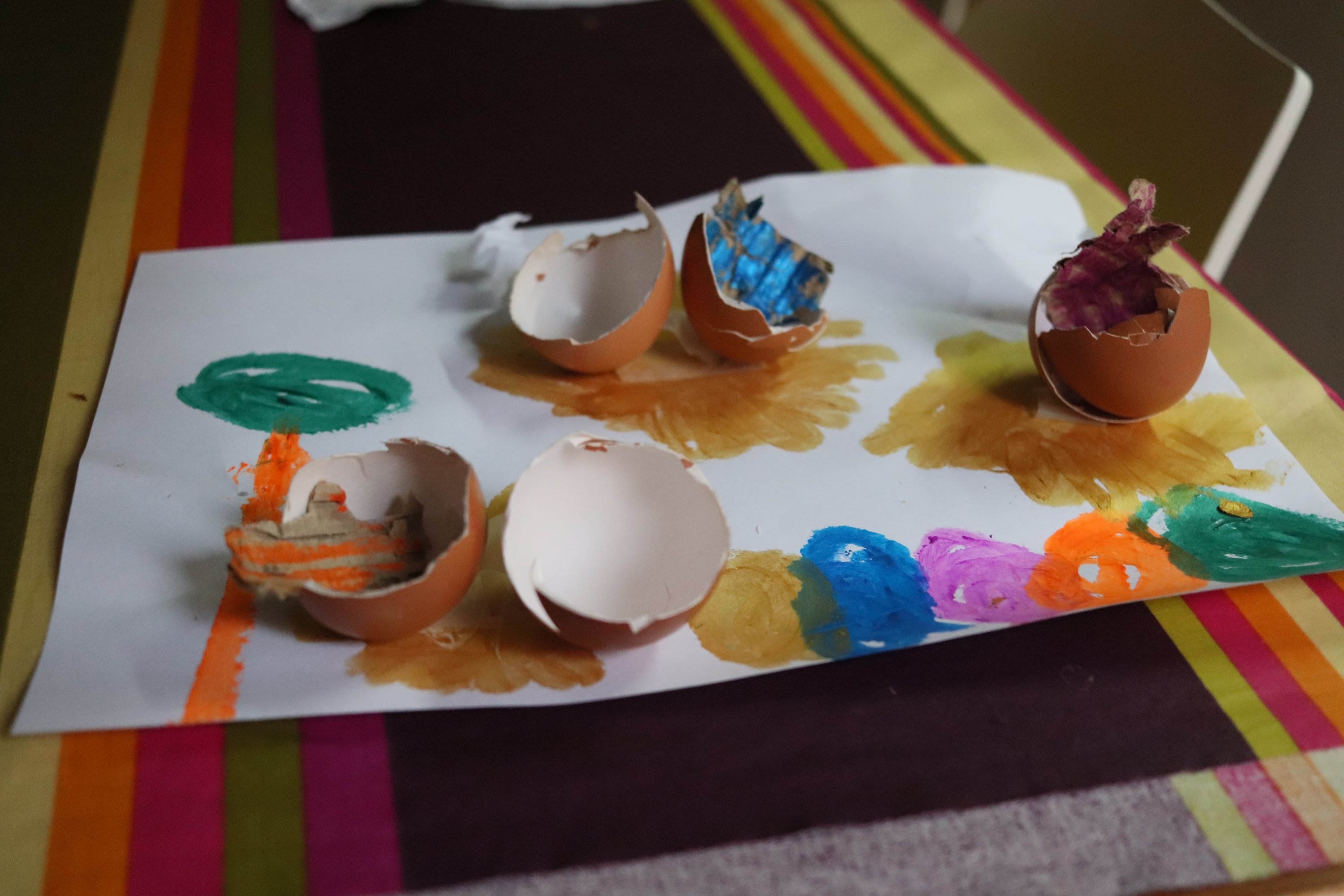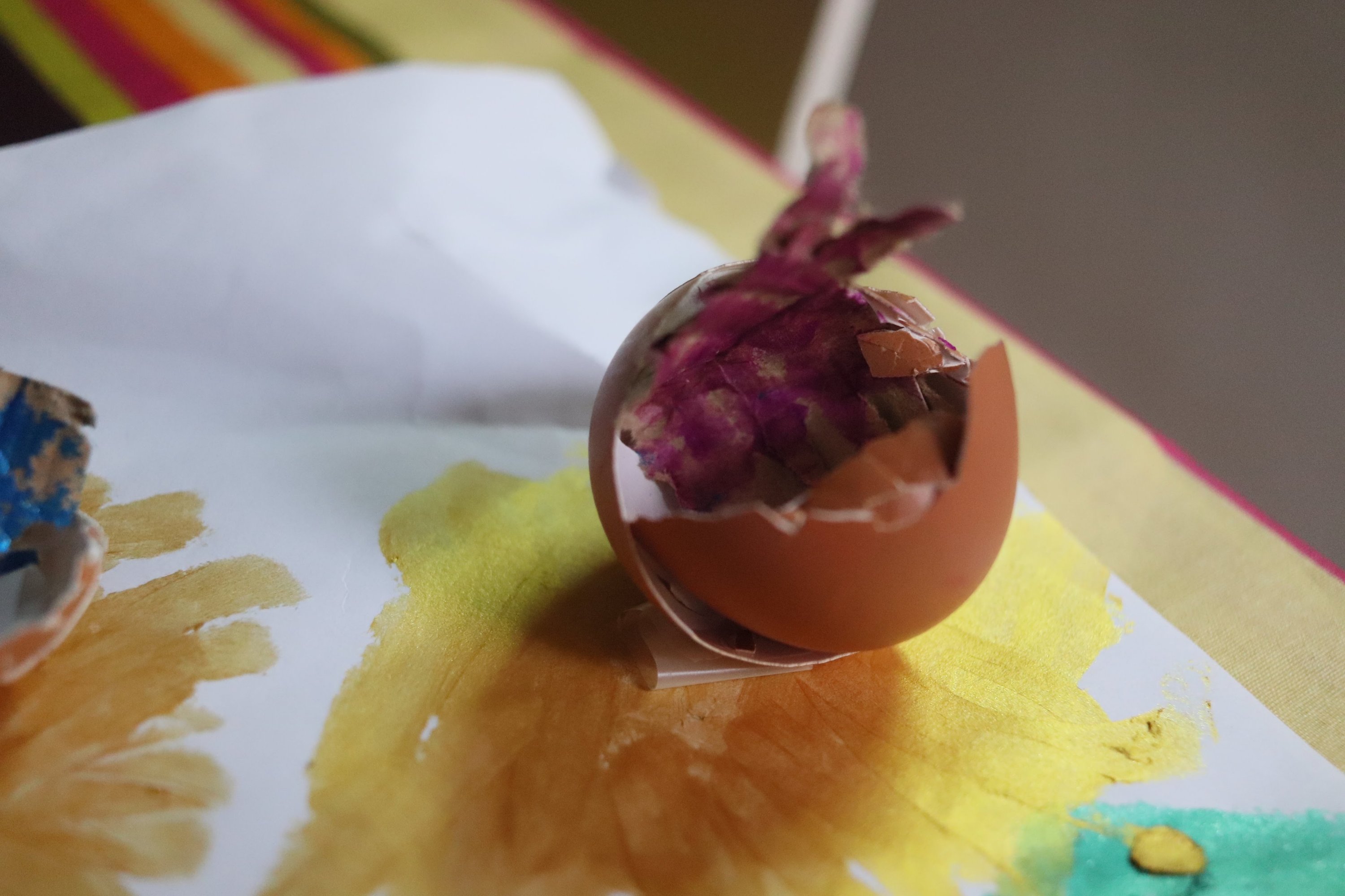 «Huevos de dinosaurio». Cáscaras de huevo, cartón, rotuladores y pegamento sobre papel. #byJulia